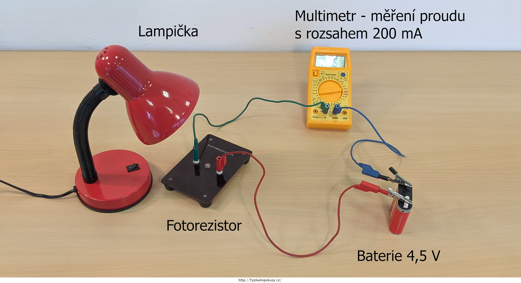 Možné provedení pokusu je vidět na videu. Multimetr měří proud obvodem, který je napájen stálým zdrojem napětí 4,5 V.